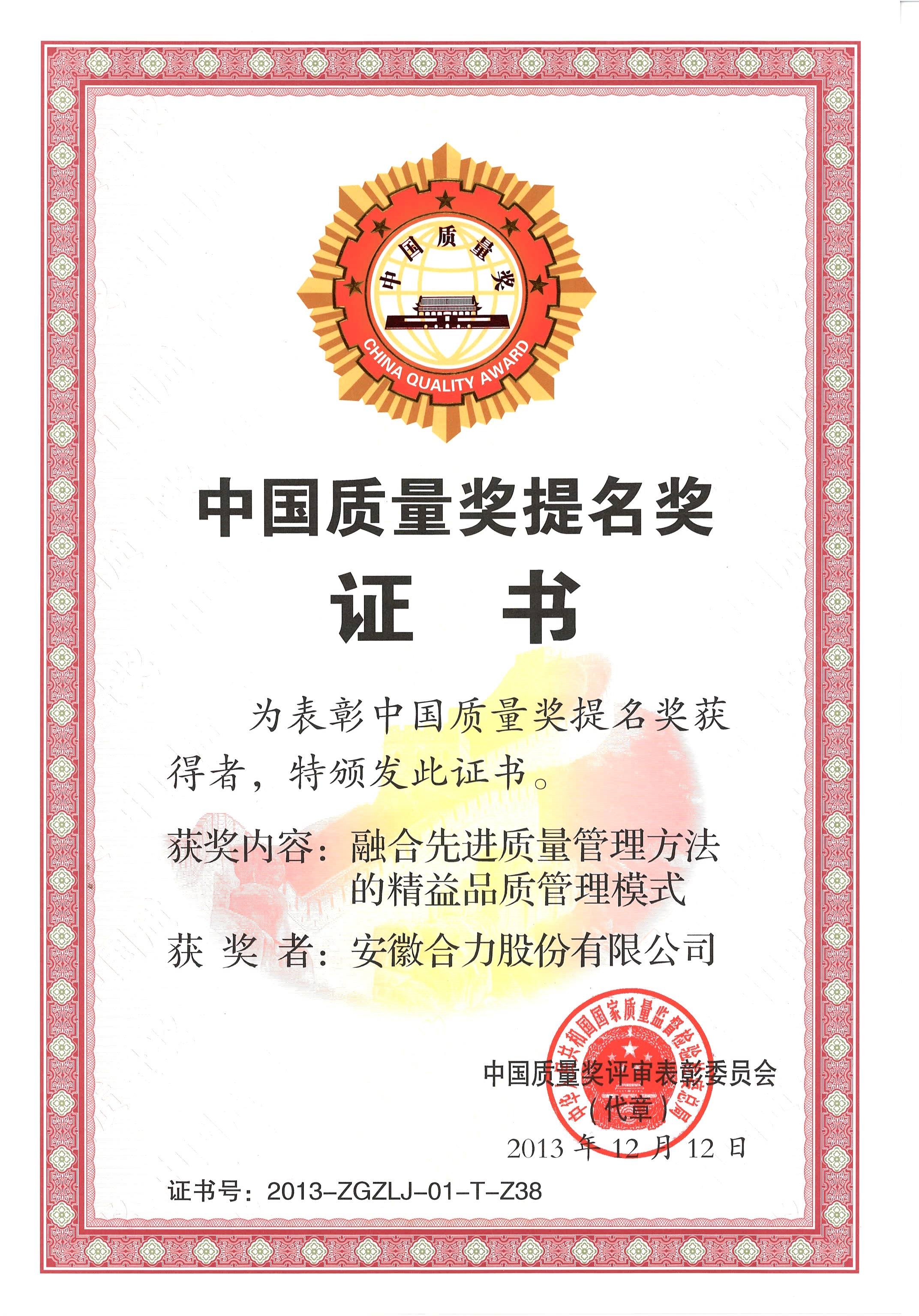 2013 中國質(zhì)量提名獎