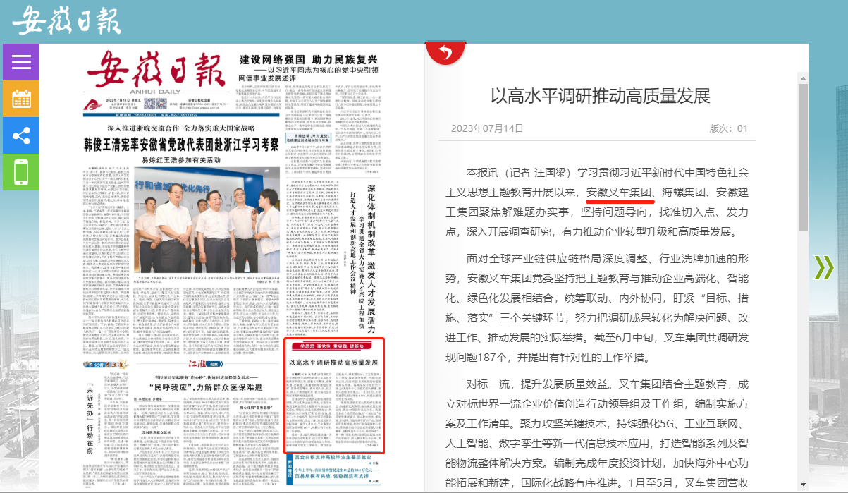 查看詳情 >《安徽日?qǐng)?bào)》報(bào)道安徽叉車集團(tuán)以高水平調(diào)研推動(dòng)高質(zhì)量發(fā)展情況